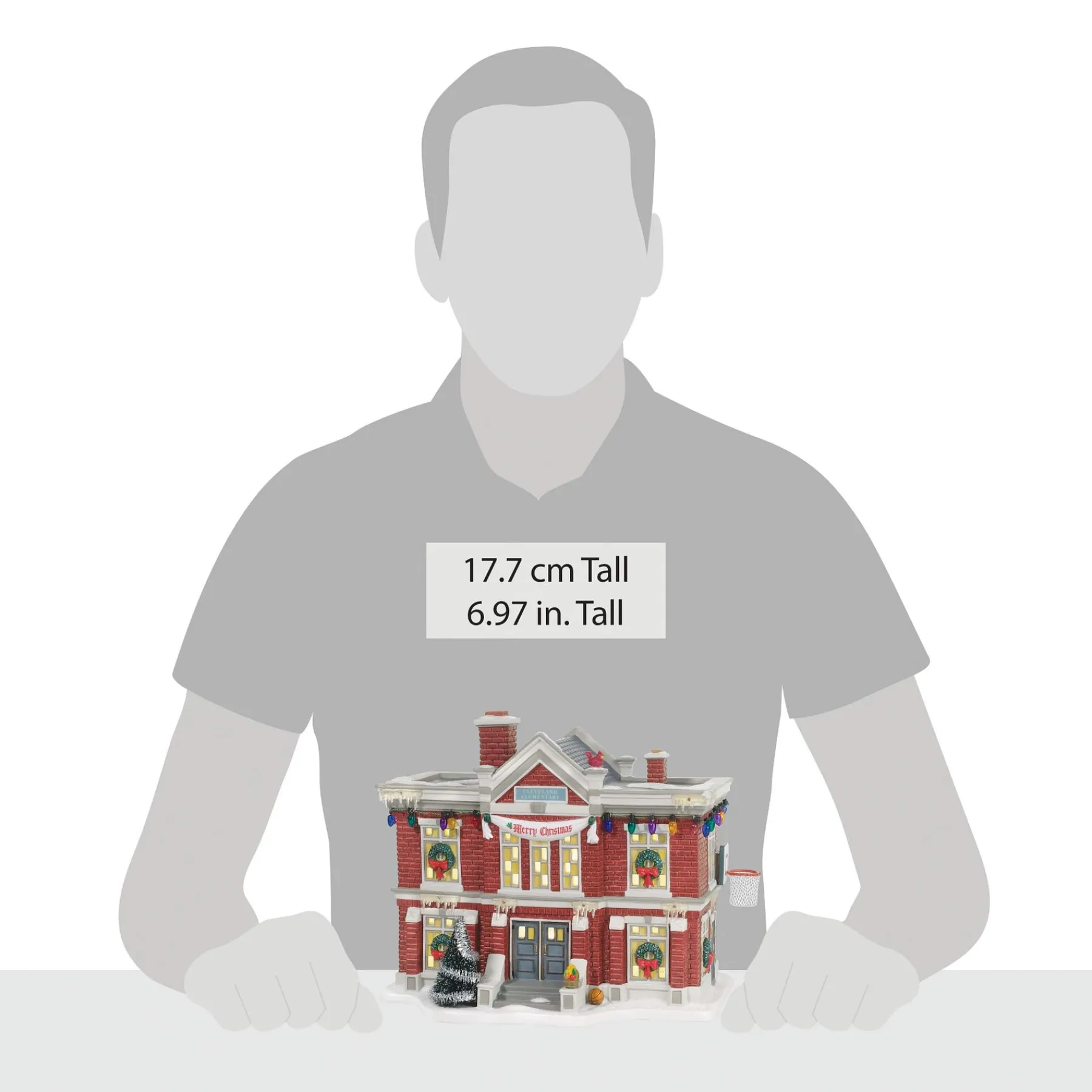 Inspired by the Cleveland Elementary School in the Warner Bros. movie “A Christmas Story”.Hand painted porcelain, with light cord.